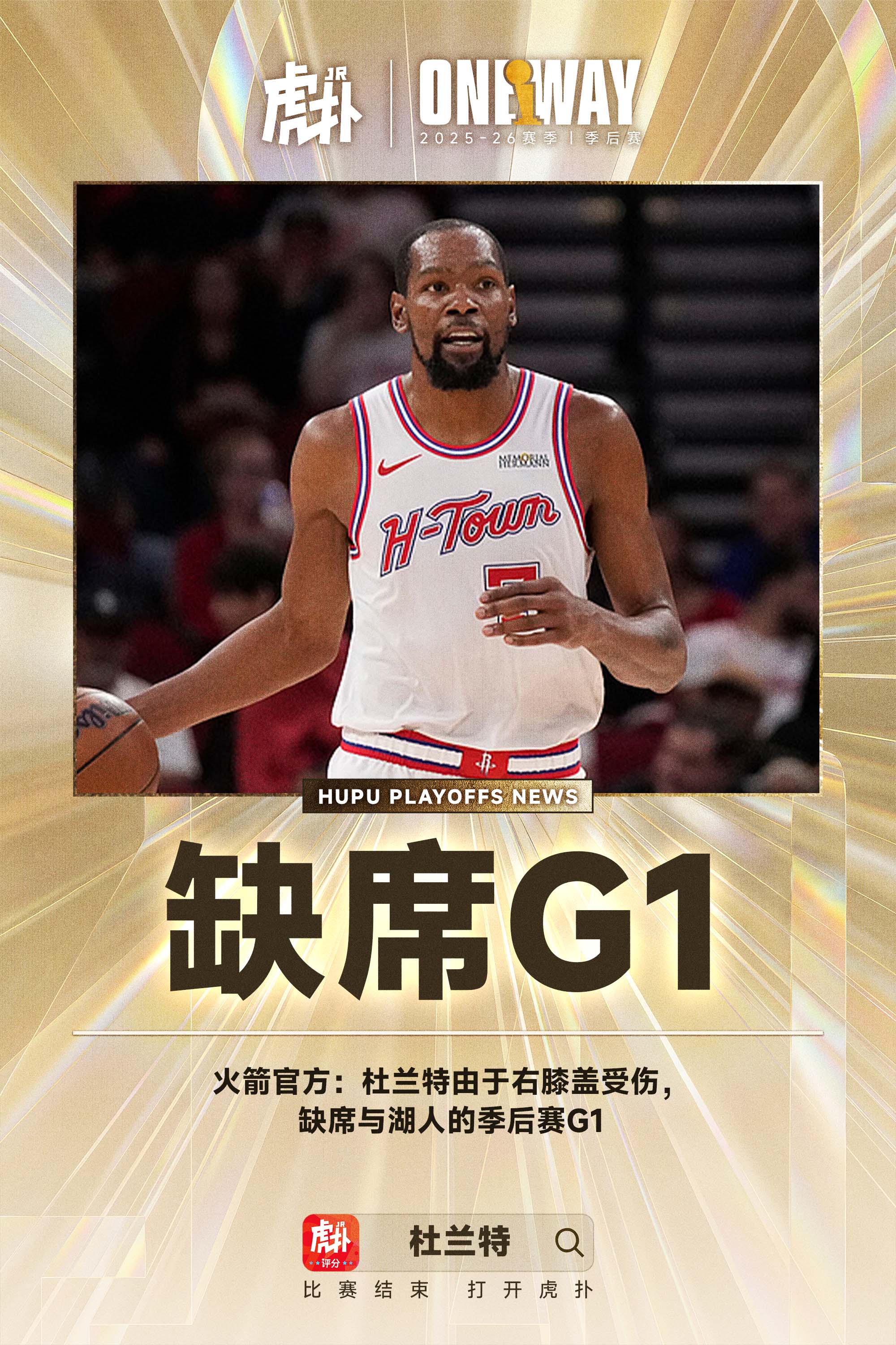 [流言板]火箭官方:杜兰特由于右膝盖受伤,缺席与湖人的季后赛G1